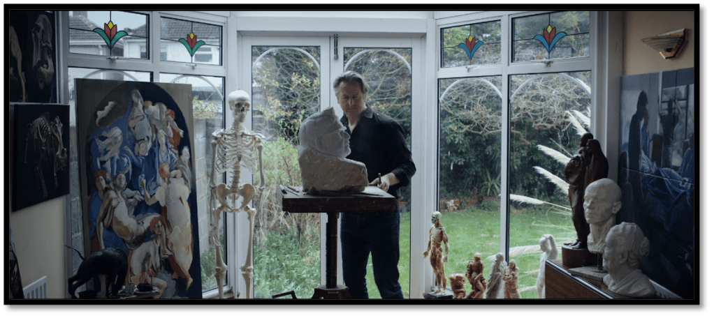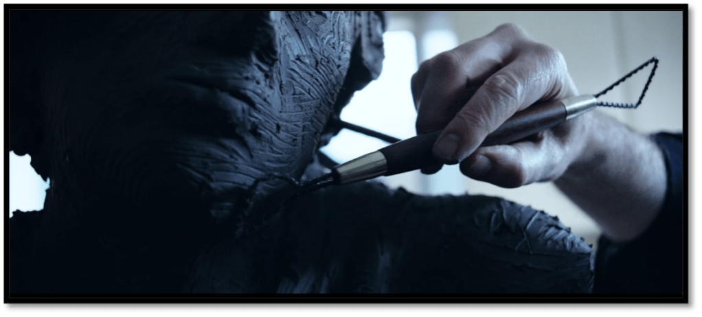 Seeing that this film delves into Ratcliff’s journey towards his use of sculpting and other art media, it becomes noticeable that visualization of the process of sculpting becomes an essential aspect of the film itself. Moreover, when discussing the notion of sculpting, Ratcliff states, “I love the humility of the clay, that you can transform a piece of mud into a magnificent mystical image.” Throughout the film, Ratcliff focuses not only on specific types of sculpted objects but also on the act of sculpting some of these objects. For instance, there are several scenes where the audience observes Ratcliff either carving or shaping his work at different stages. This inclusion of a variation in his art processing and the methods he uses to form the sculptures emphasize how crucial texture is in this film. It can also be suggested that although the narration of this film is important, the visual representation of texture is equally essential in the frame that Ratcliff is exploring. It is also imperative to note that quite similar to art, Ratcliff’s use of texture comes in several different forms. For instance, one can observe texture primarily in the art he is creating, but Ratcliff also focuses on texture in landscape, buildings, and even his own hands. What also becomes notable is Ratcliff’s consistent use of close-ups on images to infer a more in-depth meaning onto the object’s interpretation. This focus is likely to do with his fixation on connecting art and its history together as a unified body, suggesting that despite the fact that any of the images shown seem to be random on their own when they are sequenced together, they produce a unified story.