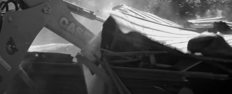 An image of an older woman standing by a fence, the shot begins with a closeup of her face the camera gently pulling back, revealing more of her body as she watches the destruction. In the background, the sounds of heavy equipment tearing their homes down. The absence of sound and imagery beg the audience to find the deeper meaning of what Pilar is trying to express.
